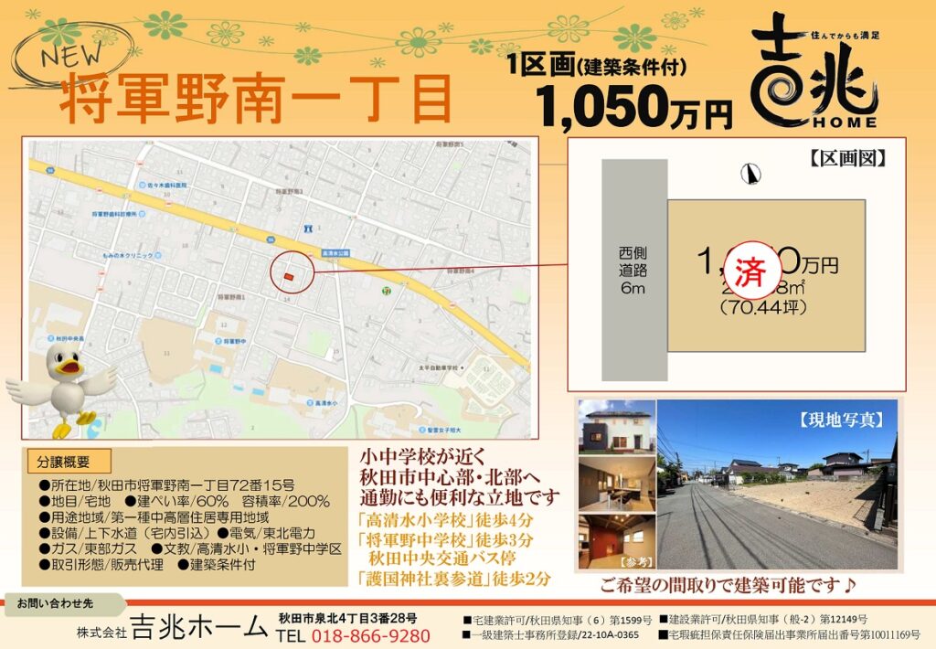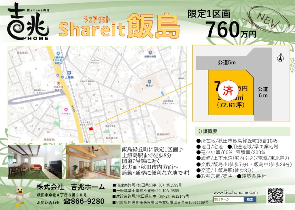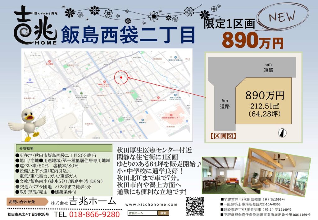 秋田市飯島西袋に1区画販売予定です。